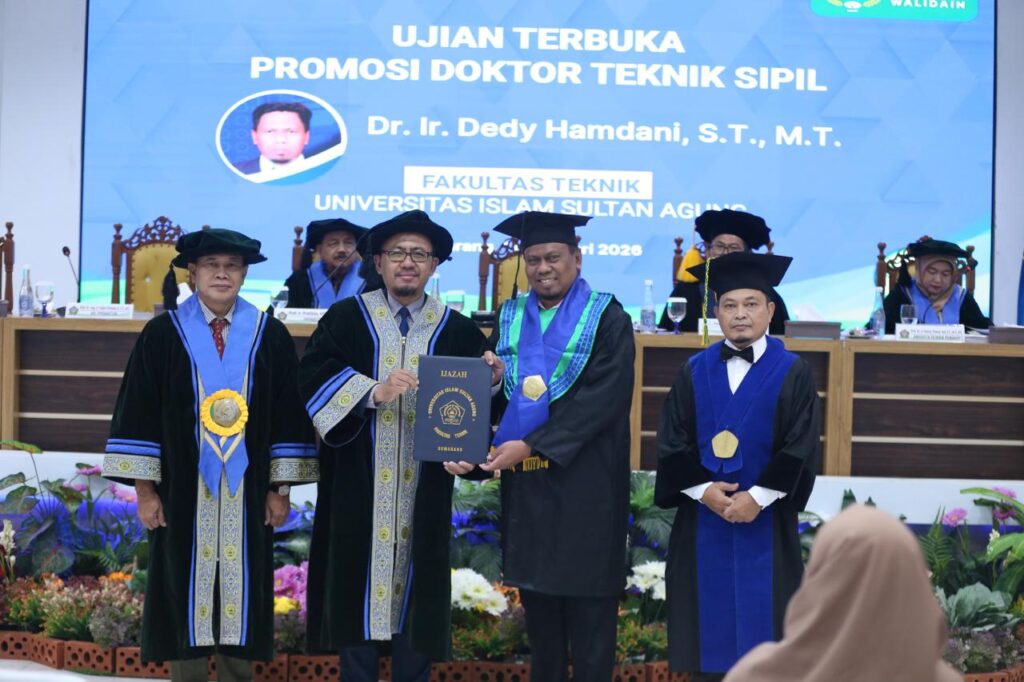 Mahasiswa Program Doktor Teknik Sipil Fakultas Teknik Unissula, Ir Dedy Hamdani ST MT mengikuti ujian terbuka doktor pada Rabu (11/2/2026) di Aula Fakultas Teknik. Ia mempresentasikan disertasinya yang berjudul peta geoteknik untuk analisis daya dukung pondasi tiang di atas tanag lunak berbasis data CPT menggunakan interpolasi GIS dan validasi PDA.
