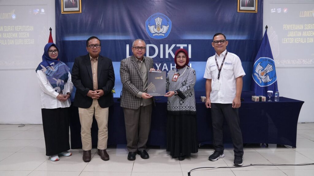 Rektor Unissula Prof Dr Gunarto SH MH mendampingi lima dosen yang menerima SK peningkatan jabatan akademik bertempat Kantor LLDIKTI Wilayah VI, Jalan Pawiyatan Luhur I No 1 Semarang (25/8/2025). Mereka adalah Prof Dr Jawade Hafidz SH MH naik menjadi guru besar. Sementara empat dosen lainnya naik menjadi lektor kepala yaitu Dr Kurniawan Yudhi Nugroho MPd , Dr Indriyati Hadi Sulistyaningrum Msc apt, Dr Nurina Tyagita MBiomed, dan Dr Rina Wijayanti Msc.