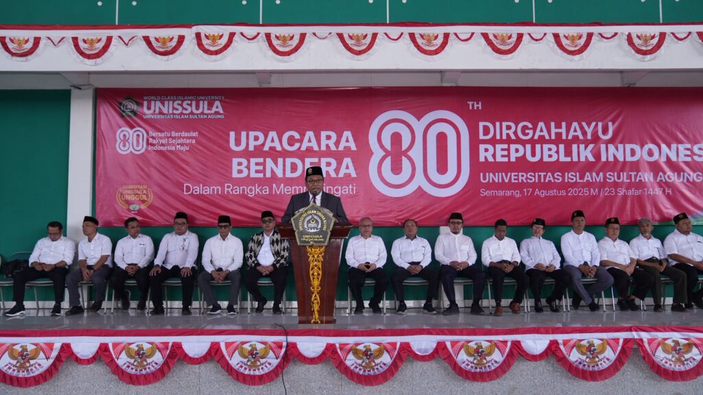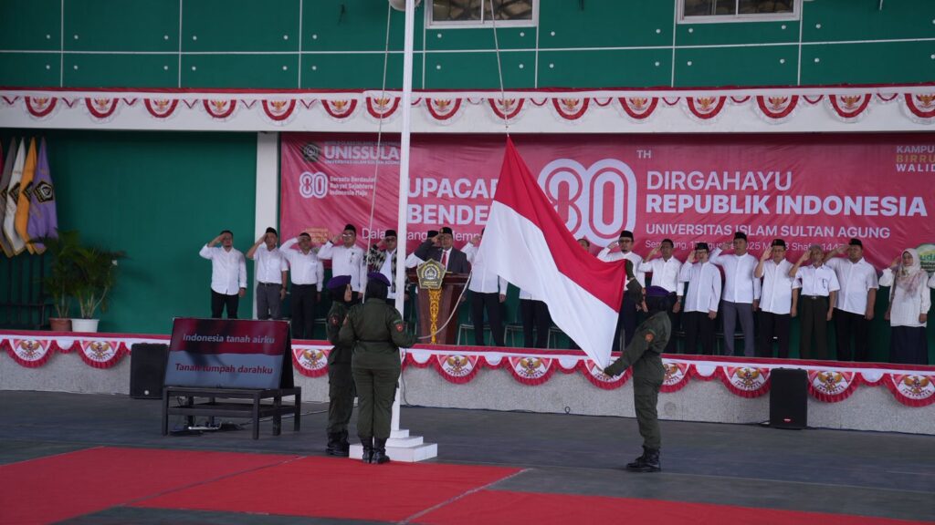 Memperingati HUT ke-80 Republik Indonesia (RI), Universitas Islam Sultan Agung (Unissula) menggelar upacara, di kampus Jalan Kaligawe, Minggu (17/8/2025). Rektor Prof Dr Gunarto SH MH dalam pidatonya, mengajak civitas akademika Unissula untuk selalu mengingat perjalanan kemerdekaan RI, yang diukir dengan pengorbanan jiwa dan raga serta semangat pantang menyerah dari pahlawan RI.
